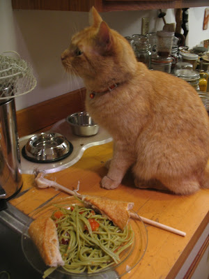 Tonight, Michael, the gorgeous orange tabby and I ate a delicious dinner together. He requested that I eat the tomatoes, because they disagree with his sensitive stomach. Small sparrows seem not to however, as he brought me another one as I called him home tonight.